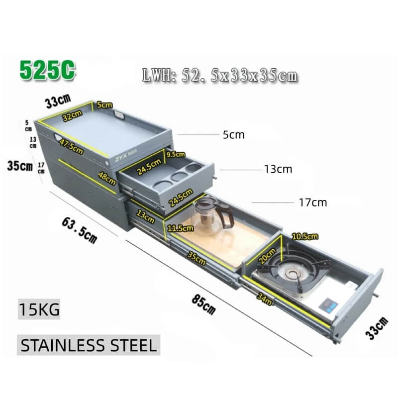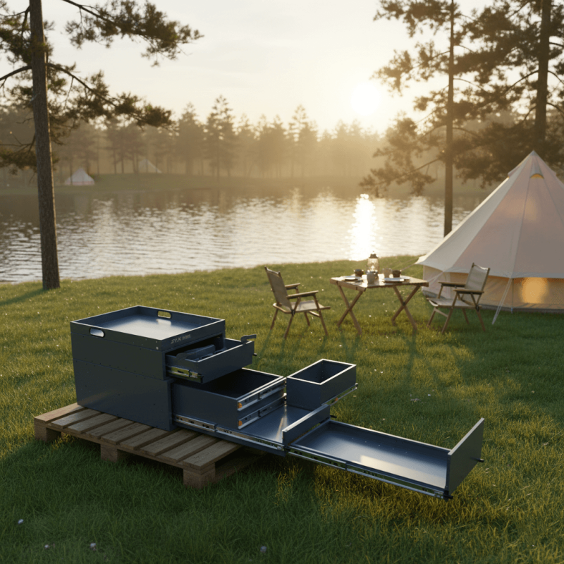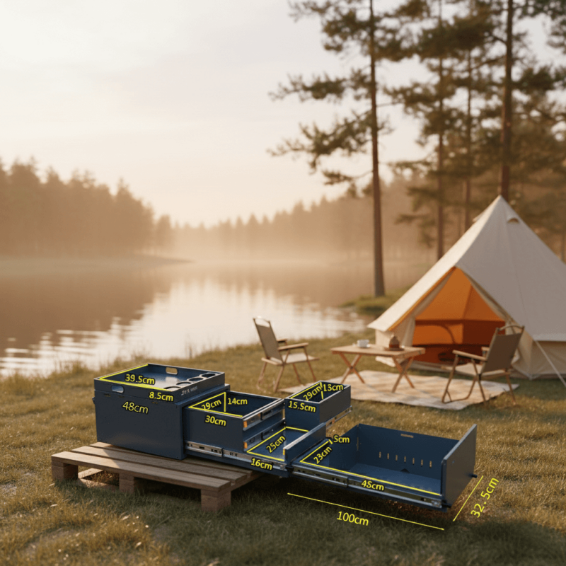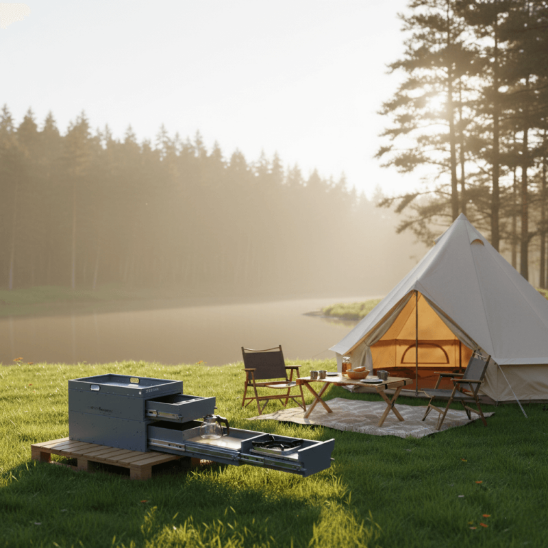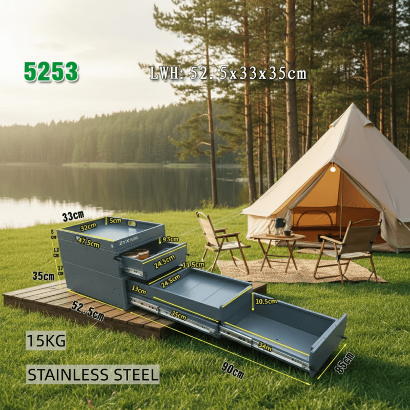 Standard camp tables are wobbly and never where you need them. The RV Outdoor Kitchen Workspace Cabinet creates a rock-solid, extended countertop right off your tailgate. It solves the "no room to chop" problem, giving you a professional-grade prep surface alongside your stove.